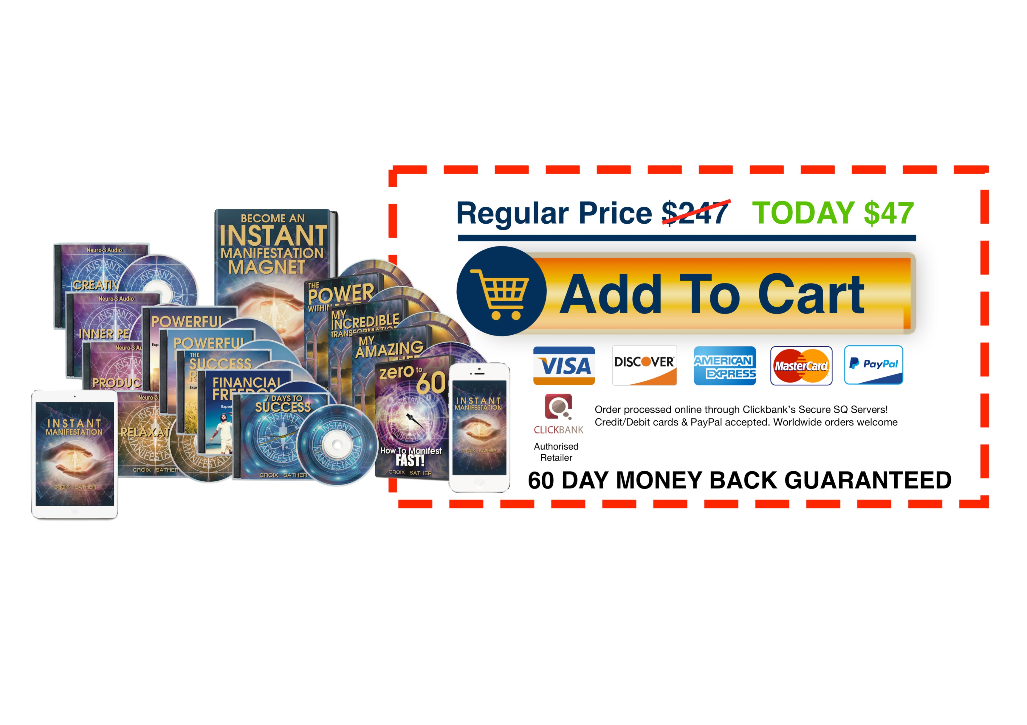 Just to make sure you feel more than comfortable with your purchase of the INSTANT MANIFESTATION SECRETS, I will guarantee your complete happiness. You will be secure in investing in your INSTANT MANIFESTATION SECRETS and see your life transform without risk. No worries, no questions, now hassle and no hard feelings, 60 day money back guarantee.